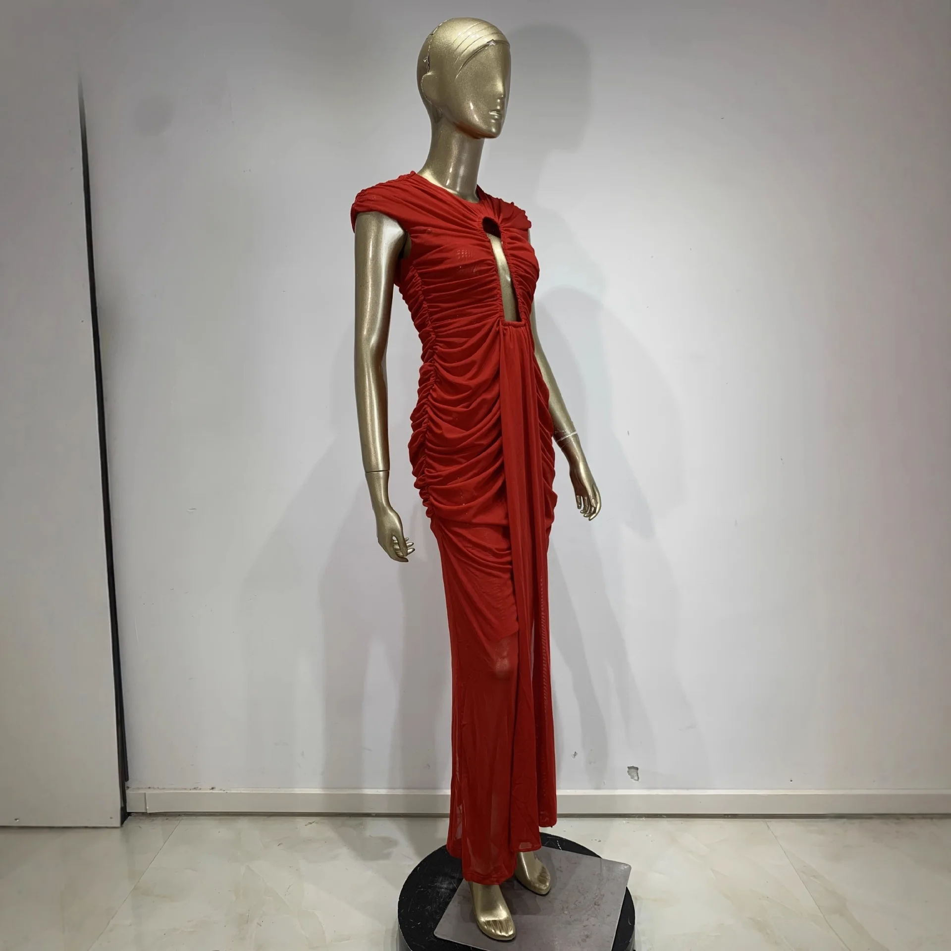 European American Women's 2026 Autumn Sexy Hollow Waist Pleated Solid Color Floor-Length Bodycon Woven Washable Party Dress 100%